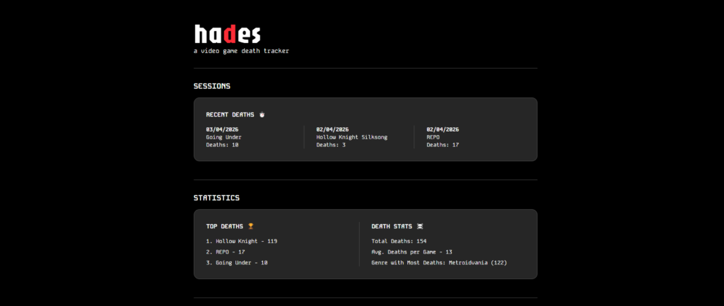 I designed and developed Hades, an app used to track deaths in video games. Powered by Contentful, this app is completely dynamic, offering statistics for each game. I also created pixel art for each of the game covers to enhance the retro appearance.